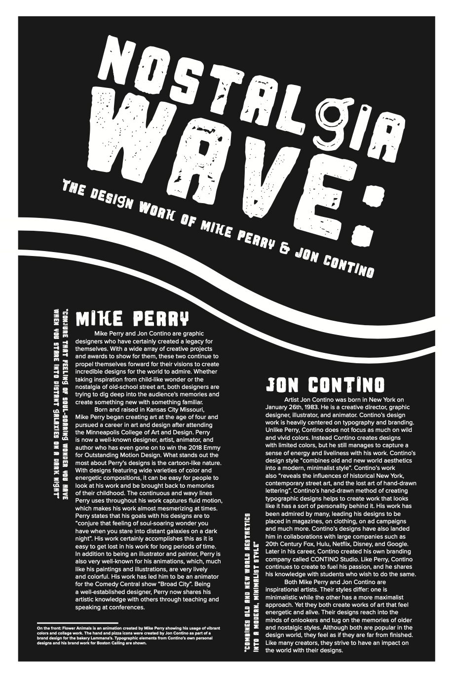 For this project, I researched the designers Jon Contino and Mike Perry. Jon Contino is known for his “old school” typographic designs, while Mike Perry is known for his colorful and cartoon-like illustrations. My initial idea was to take the illustrative styles of Mike Perry and the typographic designs of Jon Contino to craft my calendar. In the end, I used illustrative and typographic designs from both designers. Overall, this project was an interesting and engaging design challenge.